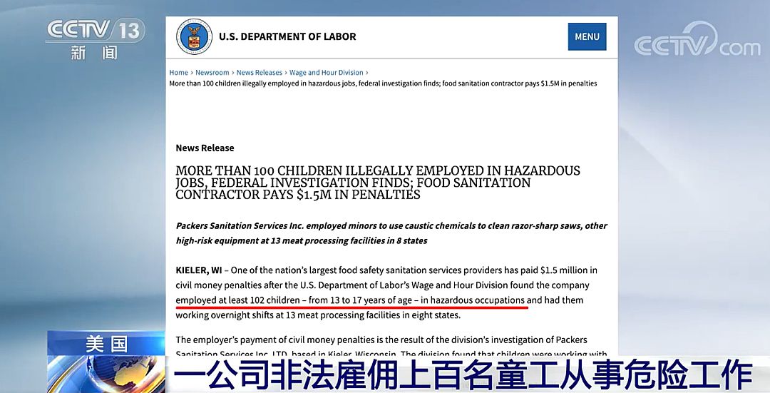 美国本地时间2月17日,美国劳工部颁布发表,正在美国一大型食物平安卫生办事供应商处出发觉至多102名13至17岁童工被不法雇佣、处置工做。