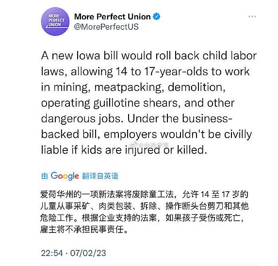 而就正在当前,美国多个州为了缓解因新冠疫情及经济萎缩所带来的用工荒,还接踵比着通过放宽童工工做时间的法案。答应14岁到17岁的儿童处置采矿、肉类包拆、拆除、操做断头台铰剪和其它工做,而若是儿童正在工做中受伤或灭亡。